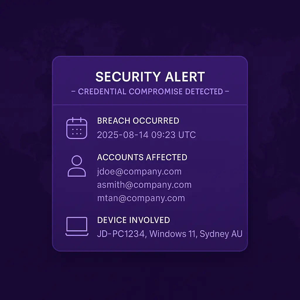 These alerts aren’t basic notifications. They include when the breach occurred, which accounts are affected, and which device or endpoint was involved, giving your security team the full context to act fast and decisively.